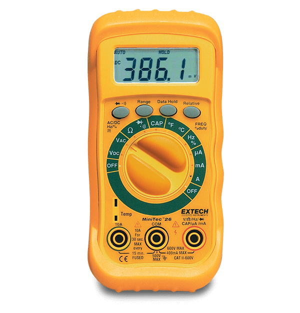 Small on size, big on versatility, the autoranging Extech MN26T MiniTec™ Digital Multimeter is equipped with extensive capabilities, making it a popular choice for technicians, electrical hobbyists/tinkerers, and DIYers alike. You can use the MN26T the way you would use a bigger meter, but you can also keep it with you for quick testing, on the road repairs, or in the field service calls. Use it to measure AC/DC voltage and current, as well as resistance, capacitance, frequency, and duty cycle. Test diodes and continuity, and use functions like data hold and relative mode. Even measure temperature with the supplied Type K bead wire temperature probe. The 4 digit, 4,000 count display is easy to read, and the built in tilt stand is handy for bench work. Comes with test leads, Type K thermocouple probe, two AAA batteries, and carrying case.