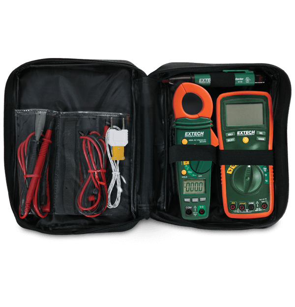 The Extech TK430 is ideal for electrical testing needs such as the installation and repair of electrical systems, HVAC equipment, and large appliances. The kit includes a model EX430 True RMS Professional Multimeter, MA200 400 A AC Clamp Meter, and a 40130 Non-contact AC Voltage Detector. Complete with test leads and Type K bead wire temperature probe. Supplied in convenient storage case that provides protection and organization for meters and accessories.