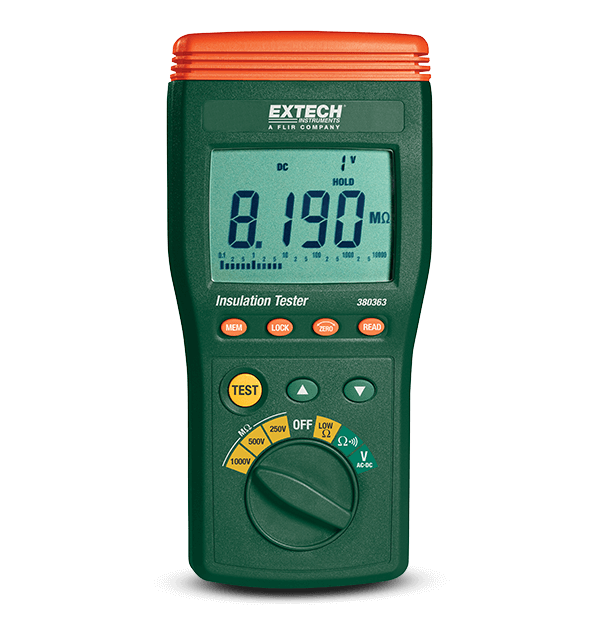 This Extech insulation tester measures up to 10GΩ with 250V, 500V and 1000V Test Voltages. Features include: Lo-Ohms for testing connections, analog bargraph for viewing trends, AC/DC Voltage measurement to 999V, manual data record/recall function (9 sets), and live circuit display warning and beeper. Can be used to test motor, transformer windings, instruments, and appliances, check for moisture in wire and cable assemblies, safely evaluate a new wiring installation, and check for carbon tracking in breakers, relays, and switches. Extech Insulation Testers offer high sensitivity to assure reliable monitoring of low resistance motor windings. Complete with carrying case, test leads, and 6 x AA batteries.