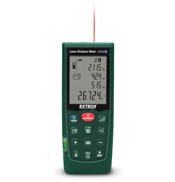 View distance measurements taken by the Extech DT500 from a remote area on your iOS device. It works with a free Apple app to display large, easy-to-read values up to 10 m (30 ft) away and measures up to 70 m (229 ft) with a target plate. In addition to distance measurements, the meter’s built-in bubble level provides easy visual guidance on determining if a surface is level. Continuous measurement function with min/max distance tracking updates every 5 seconds and it automatically calculates area and volume. Complete with carrying case, tripod mount, and 2 AA batteries