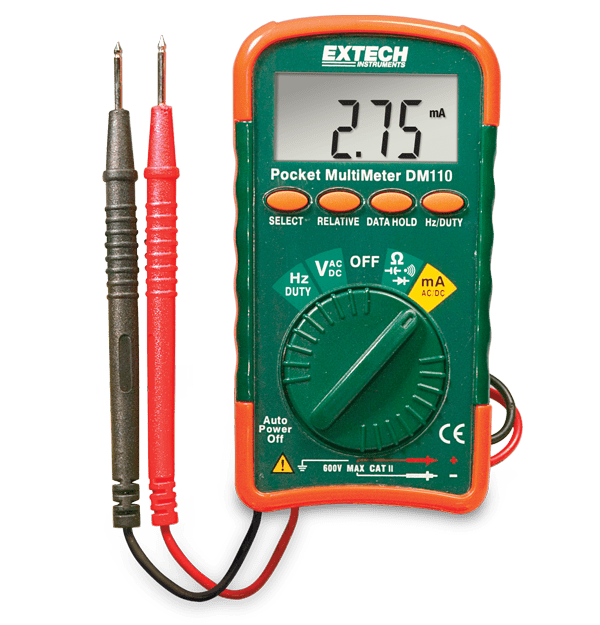 Extech's DM110 offers full function versatility and the most pocket-friendly multimeter size available. The compact, autoranging DM110 digital Mini Multimeter is equipped with capabilities that are perfect for a electrical hobbyist, electronics tinkerer, or DIYer. Use this meter to perform more in depth testing to troubleshoot anything connected to an outlet, such as any electronic devices found around the home and garage. The DM110 is great for automotive and marine electrical applications, A/V projects, Arduino projects, and secondary home wiring systems like security alarms and thermostat circuits. It includes a protective rubber holster with storage clips to retain the integrated test leads, soft carrying case, CR2032 button battery, user manual, and one year limited warranty.