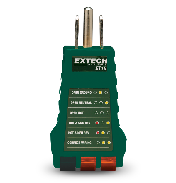 O Extech ET15 testa se há defeito na fiação em tomada de 3 fios. Detecta 5 falhas de fiação. As luzes indicam a condição do circuito. Compatível com tomadas de plugue de 3 pinos da América do Norte.