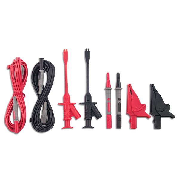 The Extech PQ500 is a CATIV test lead accessory kit for PQ3400 series power analyzers. It includes red and black version of 3 m (10 ft) test leads, test probes, alligator clips, spring loaded clips, and ergonomic overmold grips.