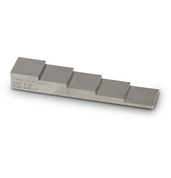 Calibre seu medidor de espessura da série TKG com o bloco de calibração TKG-CAL da Extech. Ele apresenta cinco testes de espessura de 0,25 cm a 1,27 cm (0,1 pol a 0,5 pol).