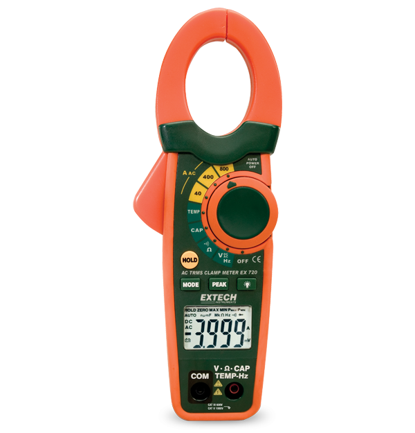 Extech EX720 是一款 800 A 交流钳形表,具有电容和频率功能。可用于测量交流/直流电流和电压、电阻、频率、电容、温度、二极管和导通性。EX720 采用双模塑外壳,可改善抓握,便于单手操作,并配有带明亮背光的大尺寸液晶显示屏。EX720 具有适合大电缆 (500 MCM) 的 30 mm 圆形钳口,并配有测试引线、9 V 电池、细珠 K 型热电偶探头和皮带保护套。