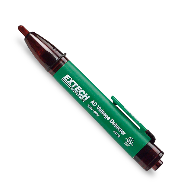 Capable of detecting the presence of live wires before testing, this pocket-size AC voltage detector features a low-profile tip that can be inserted into outlet receptacles or used to trace along wire insulation to locate breaks. The Extech 40130 measures from 100 to 600 VAC (50/60 Hz) with visual (flashing red LED) alarms and audible (beeping) tones that can be switched off. Use for line out testing, locating breaks and control panel troubleshooting. CE approved and UL Listed. Complete with convenient size with pocket clip, and two AAA batteries.