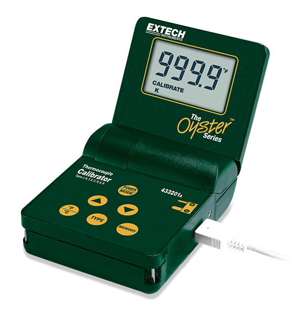 The Extech 433201 Multi-Type Calibrator Thermometer sources and measures 8 thermocouple types: J, K, T, E, C, R, S, and N. It displays output in terms of mV or in °C/°F based on its built in thermocouple tables. Five stored calibration values allow for quick calibrations. The Oyster case with a flip-up display is ideal for handheld or benchtop applications. Complete with a 9 V rechargeable battery, Type K thermocouple cable, copper calibration cable, and a 115 V AC adaptor/charger.
