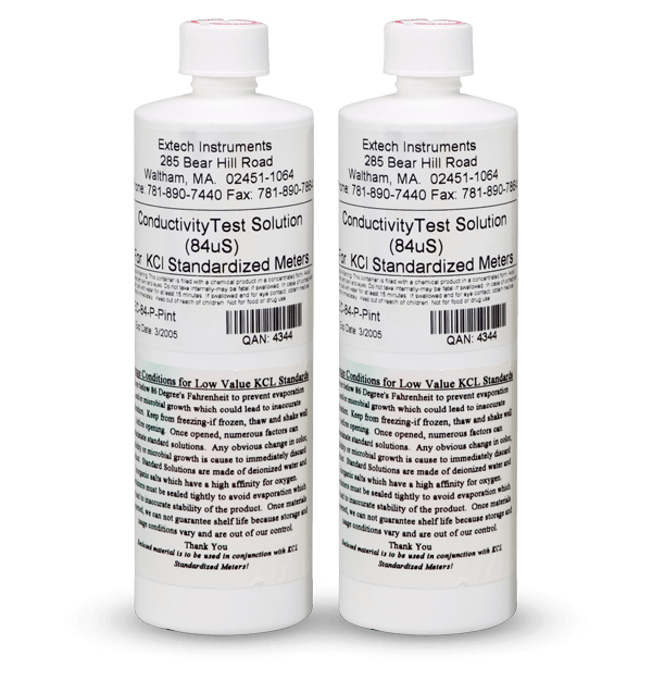 Extech EC-84-P are two bottles of Conductivity Standard, 1 pint each of pre-made solution. EC-84-P 84 µS is for use with Extech conductivity meters like the EC400 ExStik Conductivity/TDS/Salinity Meter or DO610 ExStik II DO/pH/Conductivity Kit.