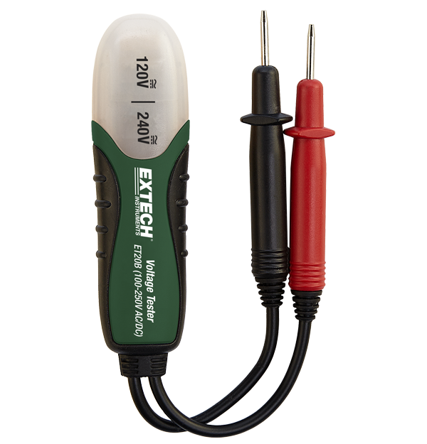The Extech ET20B is a compact-size AC/DC Voltage Detector (100-250 V AC/DC). It features a neon light voltage indicator, built-in test leads, pocket clip, and insulated housing.