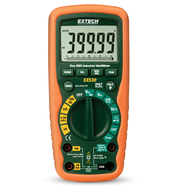 Ruggedly designed and waterproof to IP67 standards, the EX530 is ideal for use in the outdoors, on boats, and in any harsh industrial environment. It has a double molded housing and is drop-proof up to six feet with a safety rating of CAT IV 600 Volt and CAT III 1000 Volt. It measures AC/DC voltage and current, resistance, capacitance, electronic and electrical frequency, temperature, 4 to 20 mA, and duty cycle. Additional features include: 0.06% basic accuracy, continuity beeper, diode test (2.8 Volt open circuit voltage), 40000 count resolutions, backlit LCD with barograph, peak hold, min/max, relative mode, data hold and 1000 Volt input protection for all functions. Comes complete with double-molded test leads, type K bead wire temperature probe (-4 to 482 degrees F/-20 to 250 degrees C), magnetic hanging strap, case, and a 9v battery.