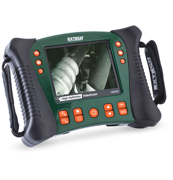 The HDV600 videoscope features eight kit options with camera probes to fit your application needs. Choose from a range of probe lengths and camera diameters with articulating and/or wireless features. This waterproof, drop-resistant videoscope has a 5.7 in. color LCD TFT with high definition 640 × 480 resolution. The SD memory card included stores more than 14,600 images. Video recording (up to 4 hours) with voice annotation. AV output for viewing images and video directly on a monitor. Video and images can be transferred to a PC via the SD card or USB output. Optional wireless transmitter allows you to transmit video up to 100ft (30 m) from the measurement point to your monitor. Includes SD card, 3.7 Volt rechargeable Li-Polymer battery, patch cable, AC adaptor, USB and AV cables, and hard carrying case.