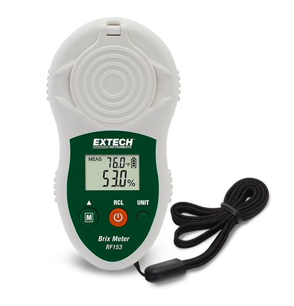 The Extech RF153 can be used to take quick and accurate % Brix or Refractive Index (RI) measurements of dissolved sucrose level in liquids for beverage and food production, determine maturity of fruits and plants, or control the concentration of industrial fluids (such as cutting coolants, hydraulic fluids, and antifreeze) to extend equipment life and prevent corrosion. With a fast three second response time, the LCD displays % Brix or RI and temperature. The RF153 fits in the palm of your hand and it features built-in ATC, single zero calibration, prism cover, and auto memory storing 10 readings. It has rugged, low maintenance, water resistant (IP65) housing with convenient side spouts for easy drainage.